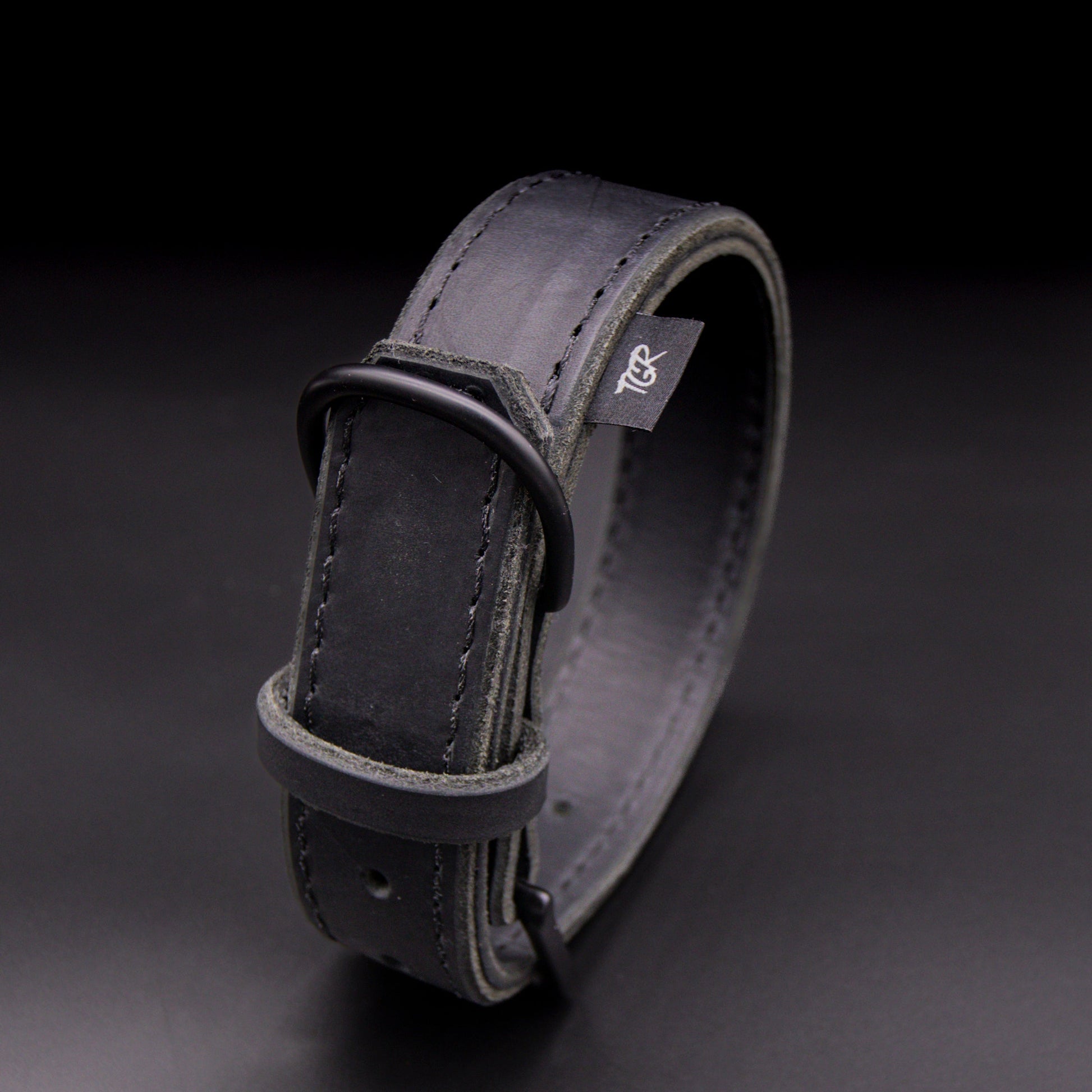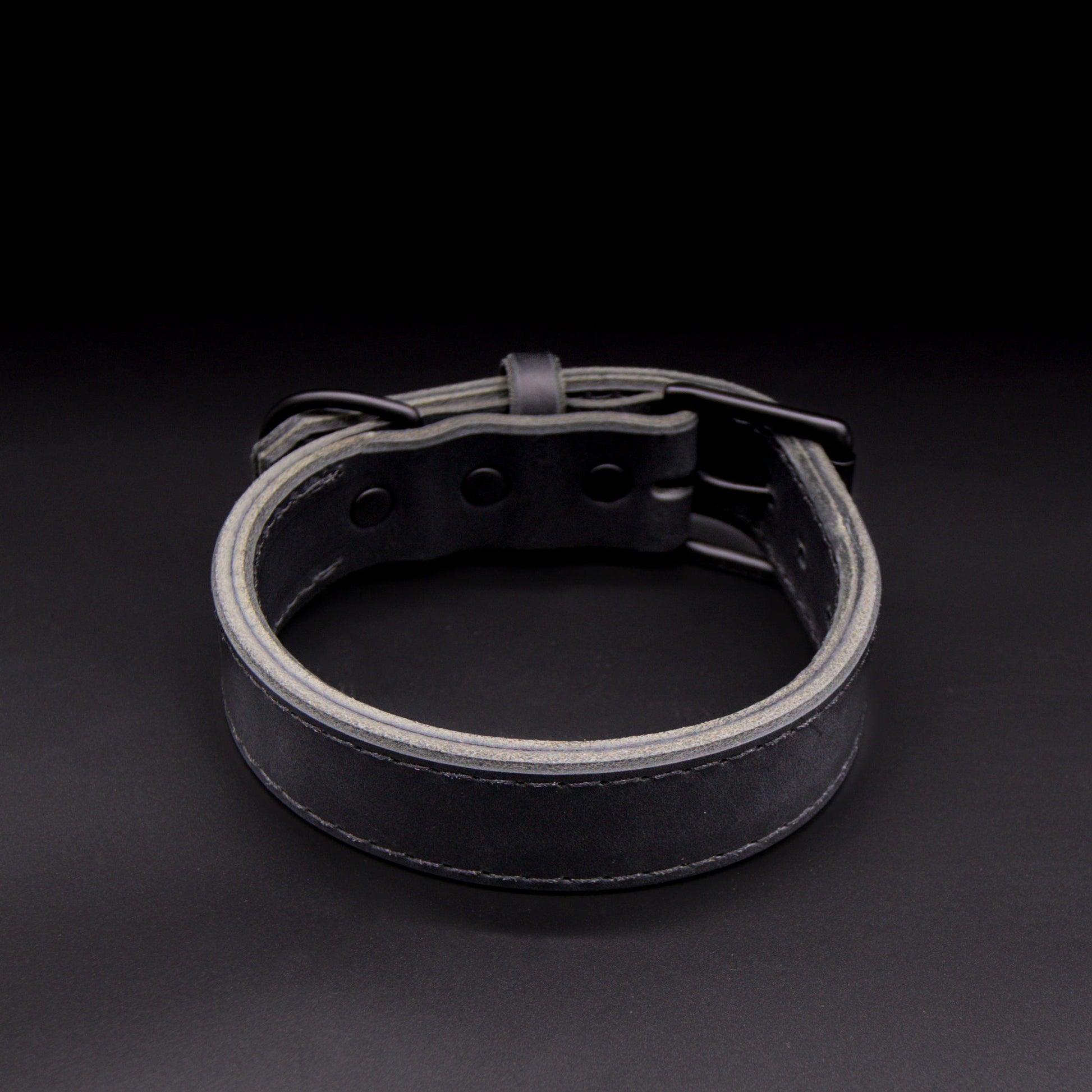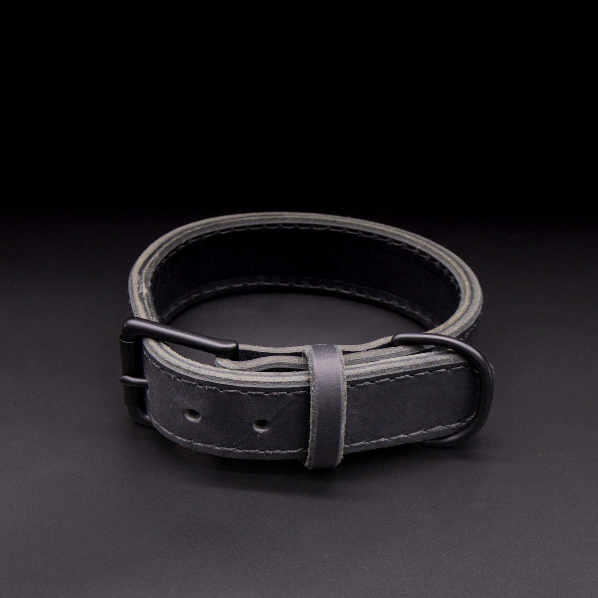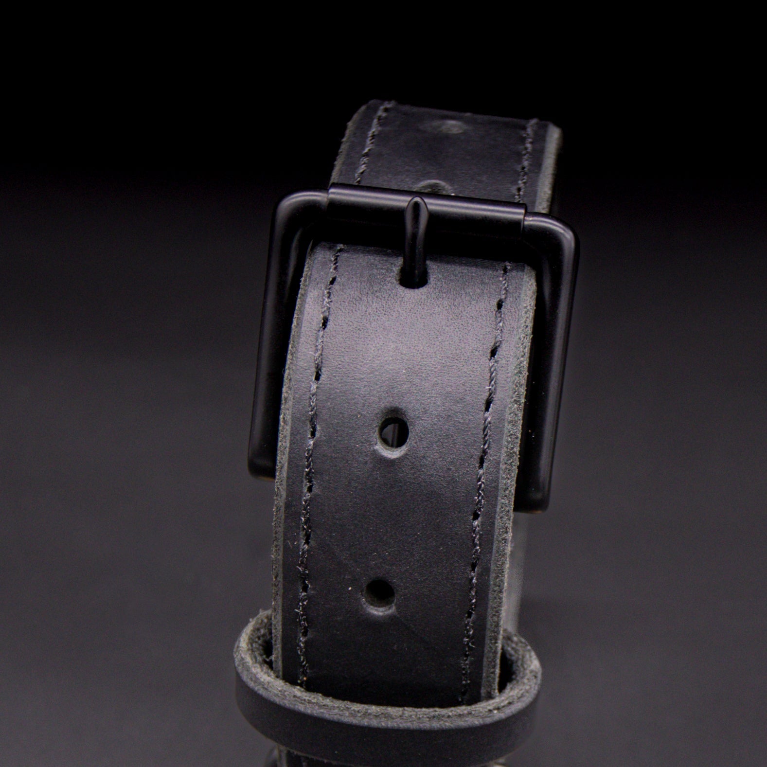 This 1.5” Dog Collar is made with the highest quality materials that we can find. The black leather is 10-11oz thick and stitched with a heavy #346 nylon thread. This collar is made to withstand anything, it is one of the highest quality and strongest collars that you can buy. That being said leather does not do well with water, so please remove the collar from your dog before swimming or giving them a bath.