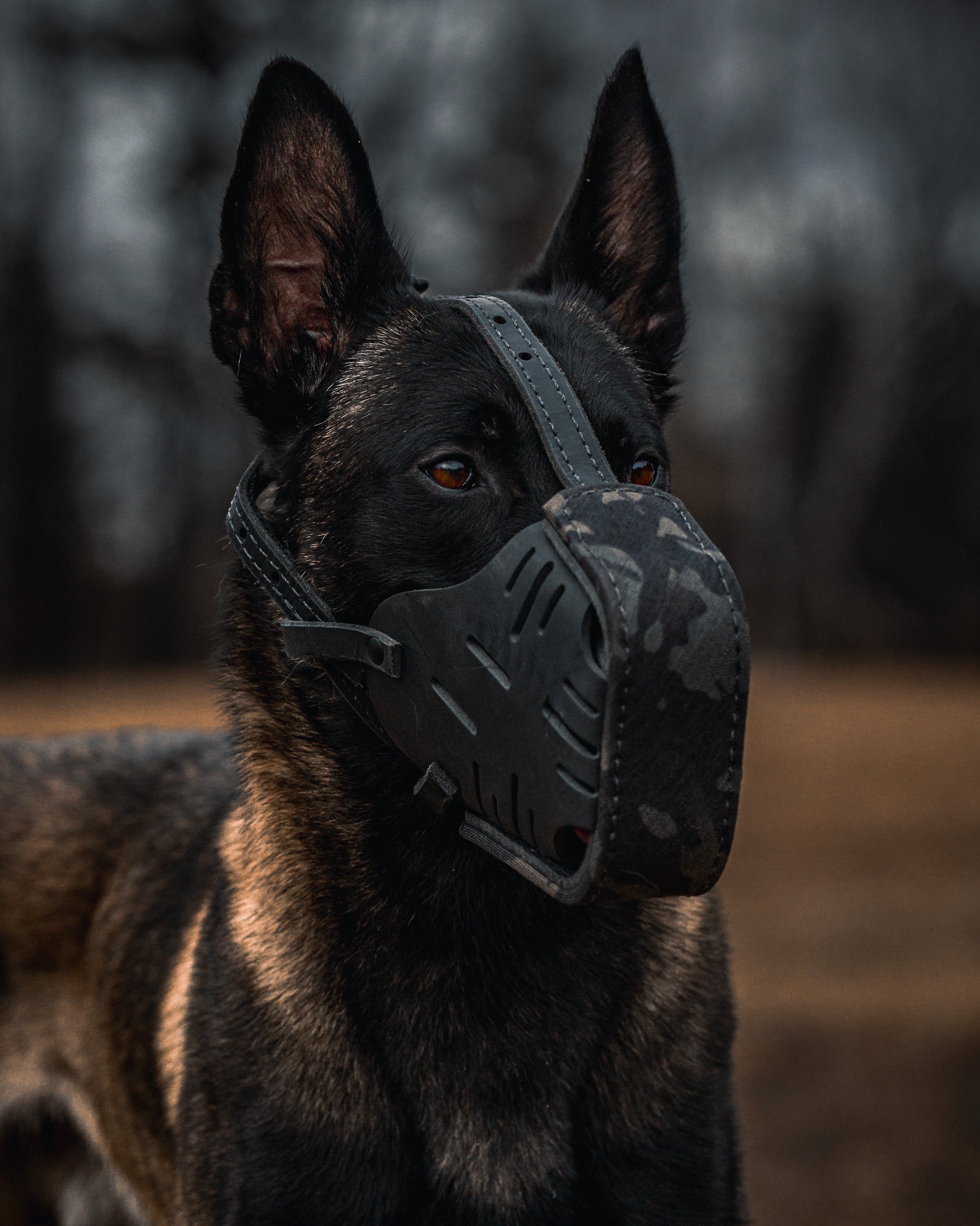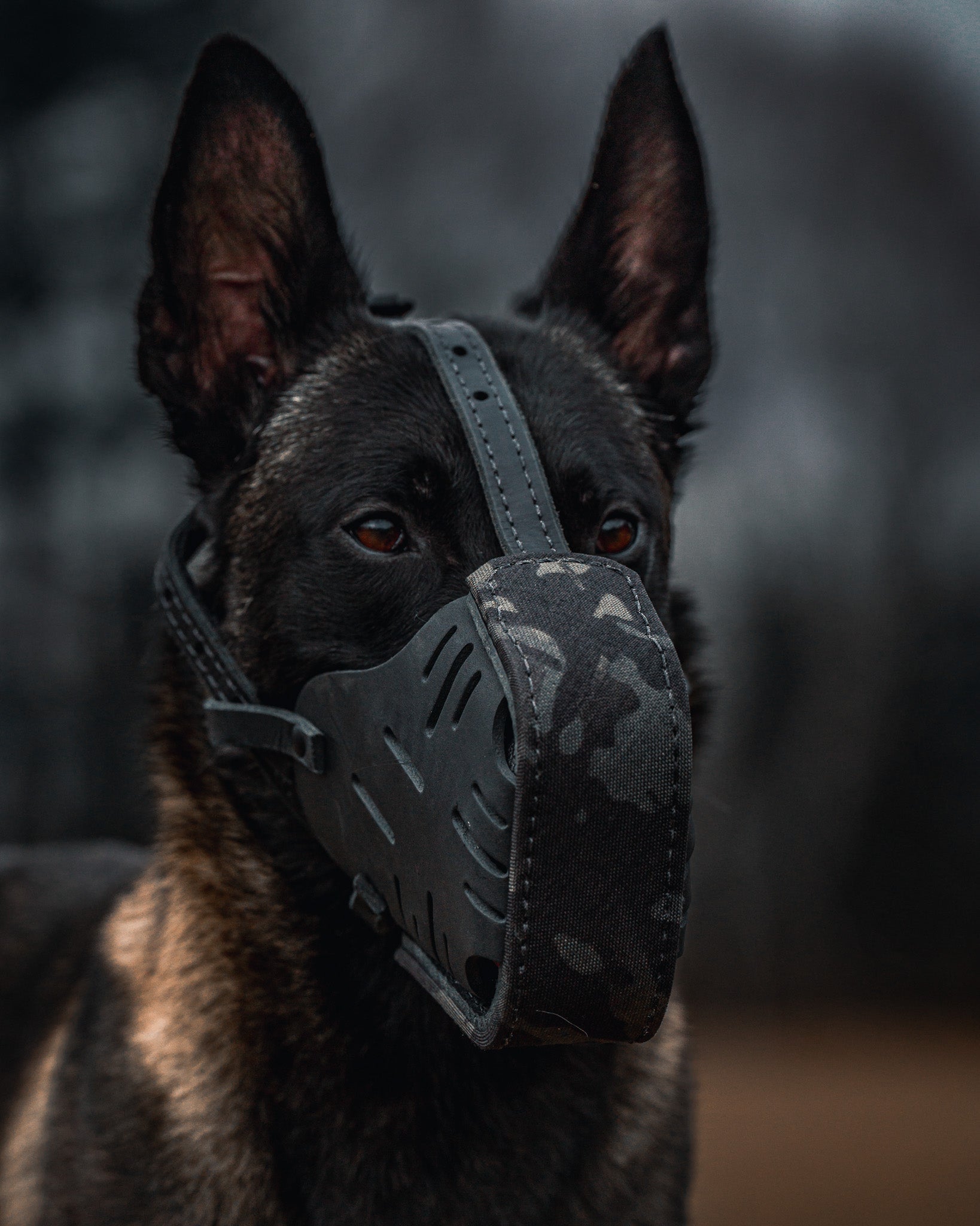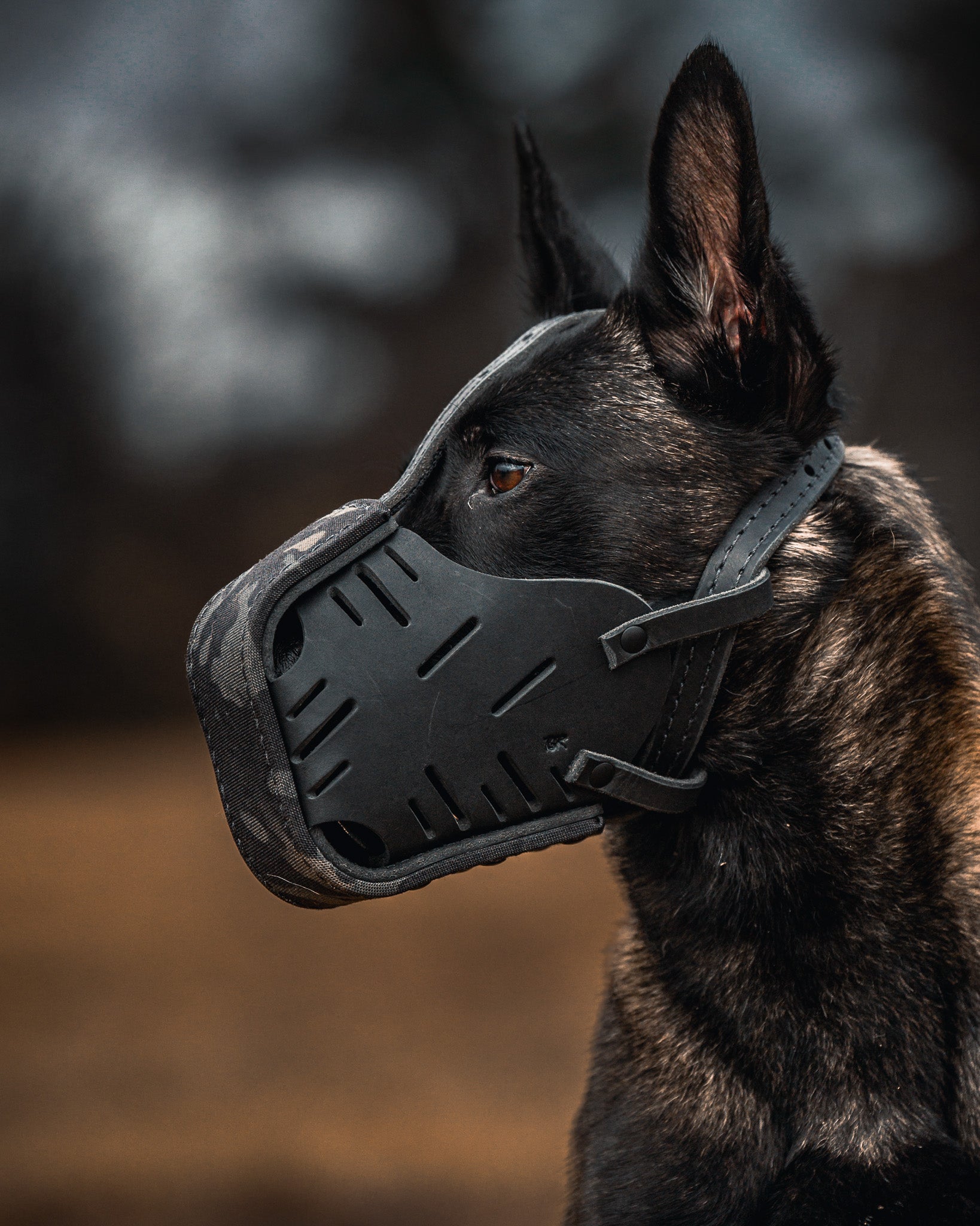 This muzzle is wrapped in Multicam Black Cordura. The inside of the muzzle cage measures 3" on top and 4.5" on the bottom. Straps are both nylon reenforced and adjustable. Pure brass hardware treated with a high resistance to scratching black finish. The muzzle fits most Mals, Dutchies, Labs and shorter snout Shepherds.