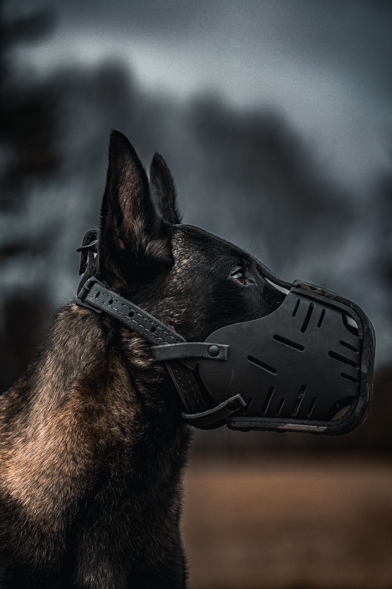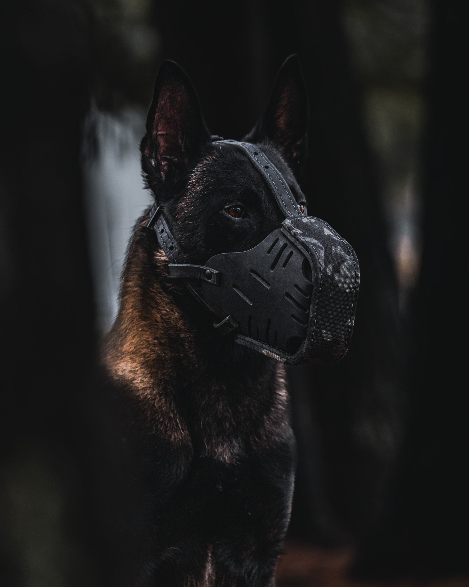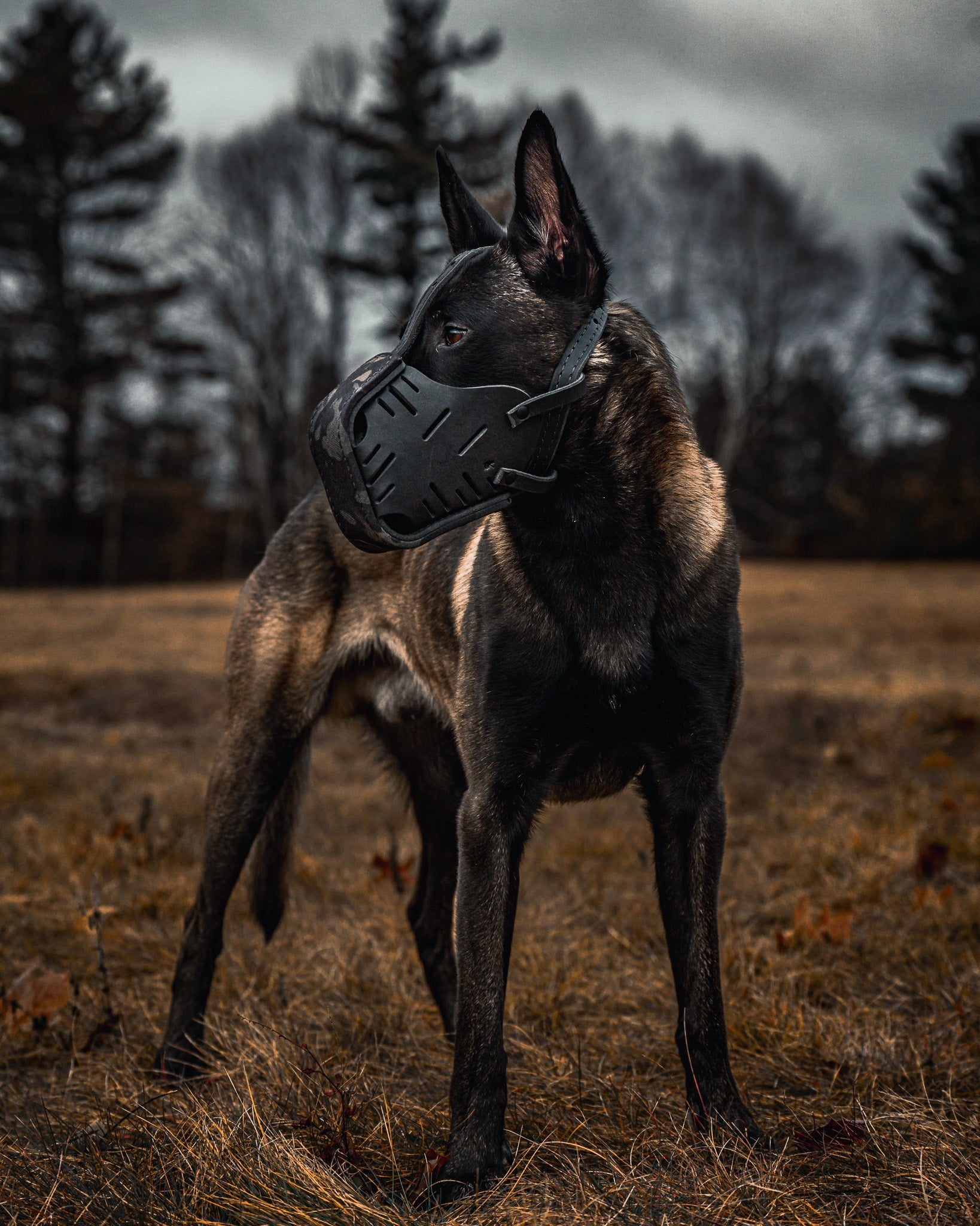 This muzzle is wrapped in Multicam Black Cordura. The inside of the muzzle cage measures 3" on top and 4.5" on the bottom. Straps are both nylon reenforced and adjustable. Pure brass hardware treated with a high resistance to scratching black finish. The muzzle fits most Mals, Dutchies, Labs and shorter snout Shepherds.