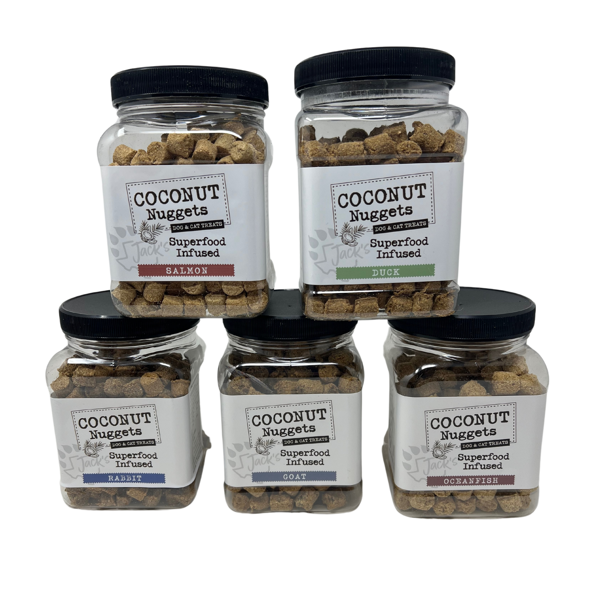 Jack's Premium Coconut Nuggets are made with organic coconut flour and superfood fruits, veggies and spices. These treats are easily digestible, high in protein, and low calories. They are an excellent training treat and are a great option for dogs with food allergies or sensitivities. These treats are made without grains or preservatives. Coconut Nuggets are an all-natural treat for both cats and dogs that can be used for training, food toppers, or just a healthy reward.