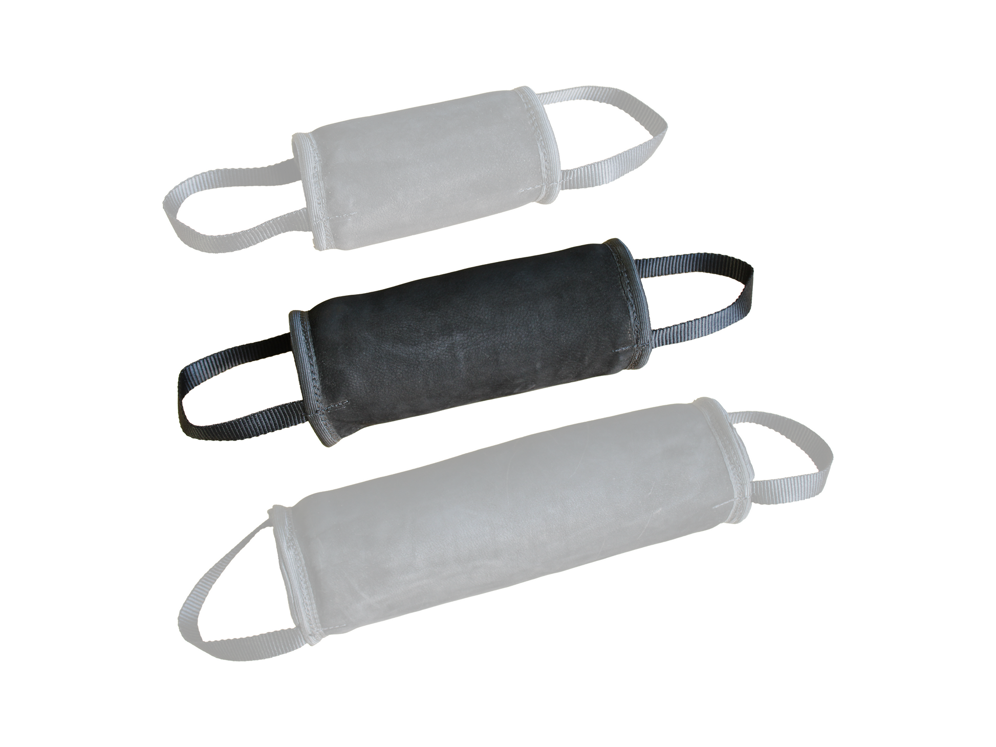 Crafted from genuine leather and filled with synthetic fibers, this teether measures approximately 10 inches long and 4 inches in diameter.