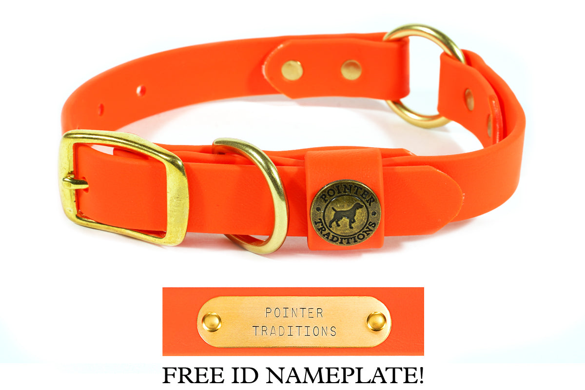All collars come with a FREE custom brass ID nameplate! All nameplates are secured to the collar with solid brass rivets.