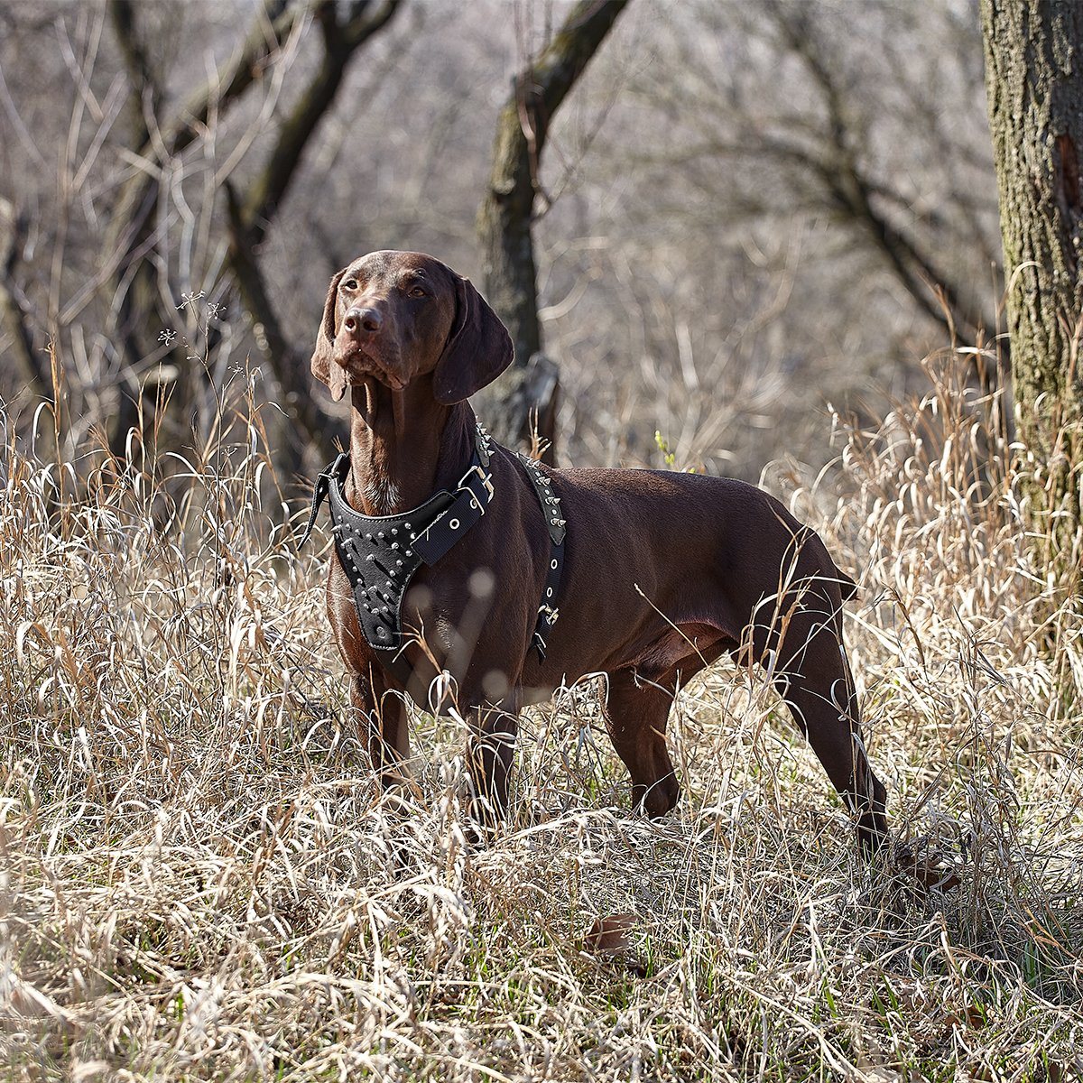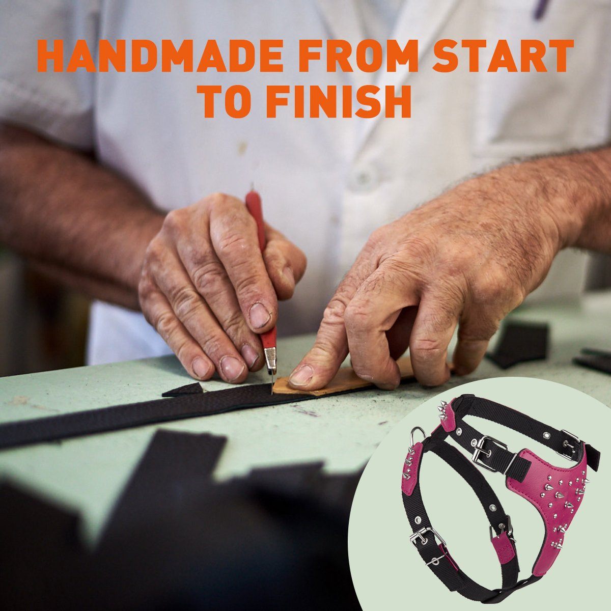 These fine 100% genuine leather + nylon spike harnesses bring together simplicity and elegance thanks to their elaborate workmanship.