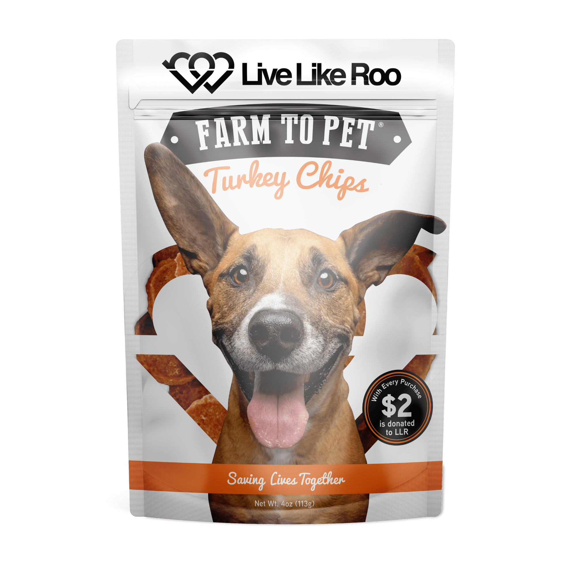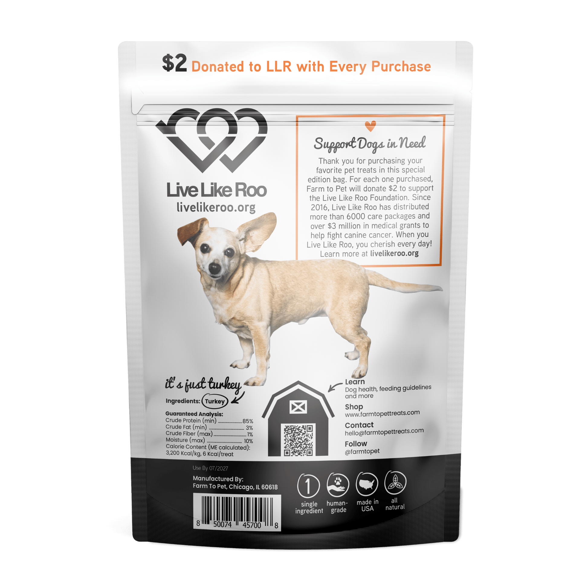 Farm to Pet "Live Like Roo" Turkey Chips fill pet tummies with healthy dog snacks and help support a worthy cause with every crunch. For each special edition bag of these single-ingredient treats purchased, we donate $2 to the Live Like Roo Foundation to further their mission of improving quality of life for dogs and their families battling canine cancer through veterinary care, care packages and more.