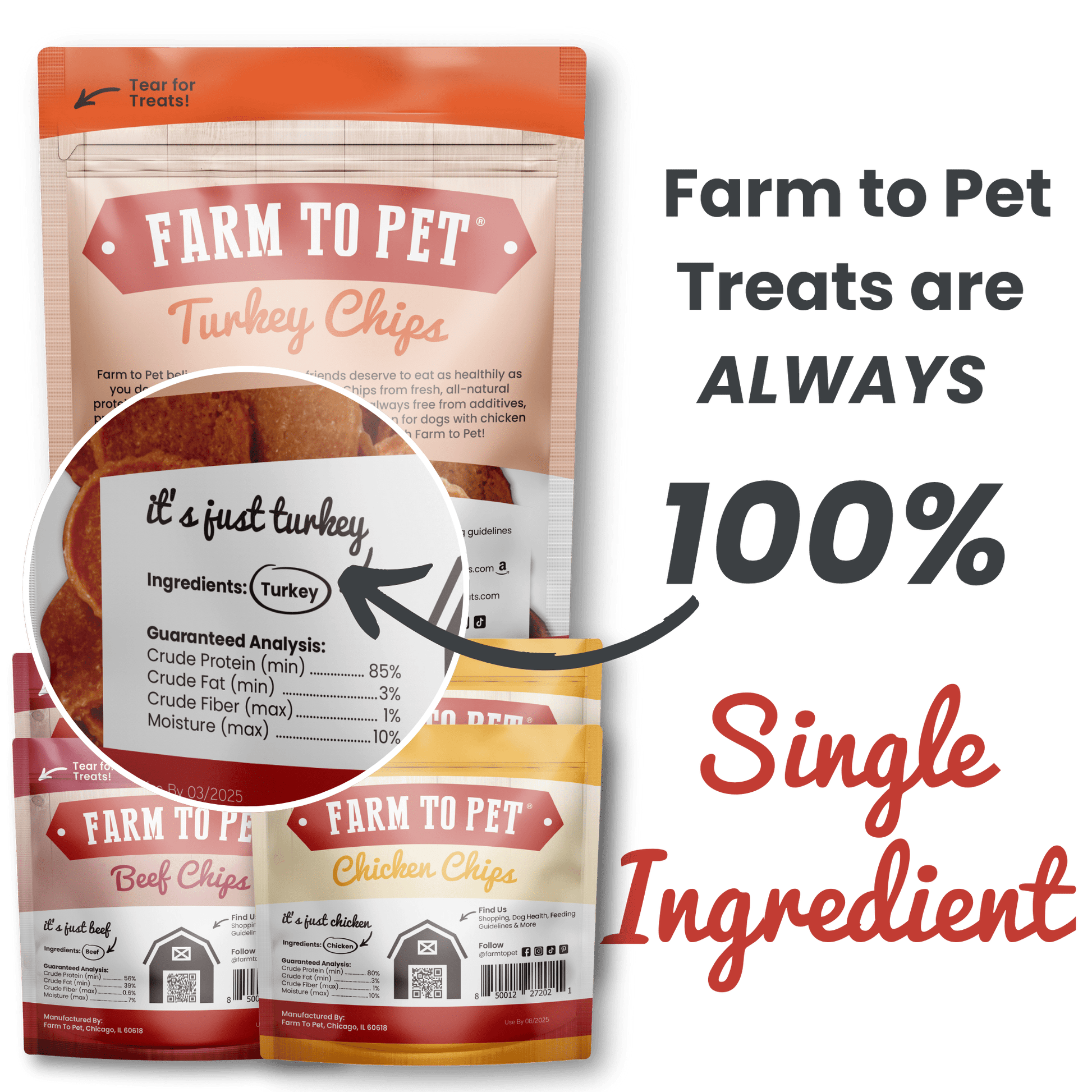 As puppies digestive tracts and systems develop, they can sometimes experience tummy troubles. Fortunately, Farm to Pet's healthy dog treats are single-ingredient and all natural, with no fillers, byproducts or preservatives lurking to irritate puppy stomachs, making it easy to isolate any reactions your pup might have to other foods. Plus, dehydrated poultry breast - especially turkey - is low allergen, easy to digest, and super delicious to fur babies!
