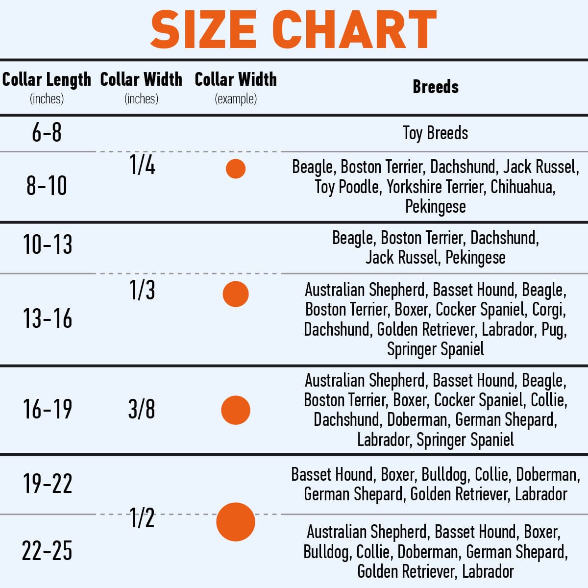 Our sizing is based on actual measurements from the buckle to the first and last holes. Be sure to measure your dog’s neck before ordering, as sizes can vary between brands.