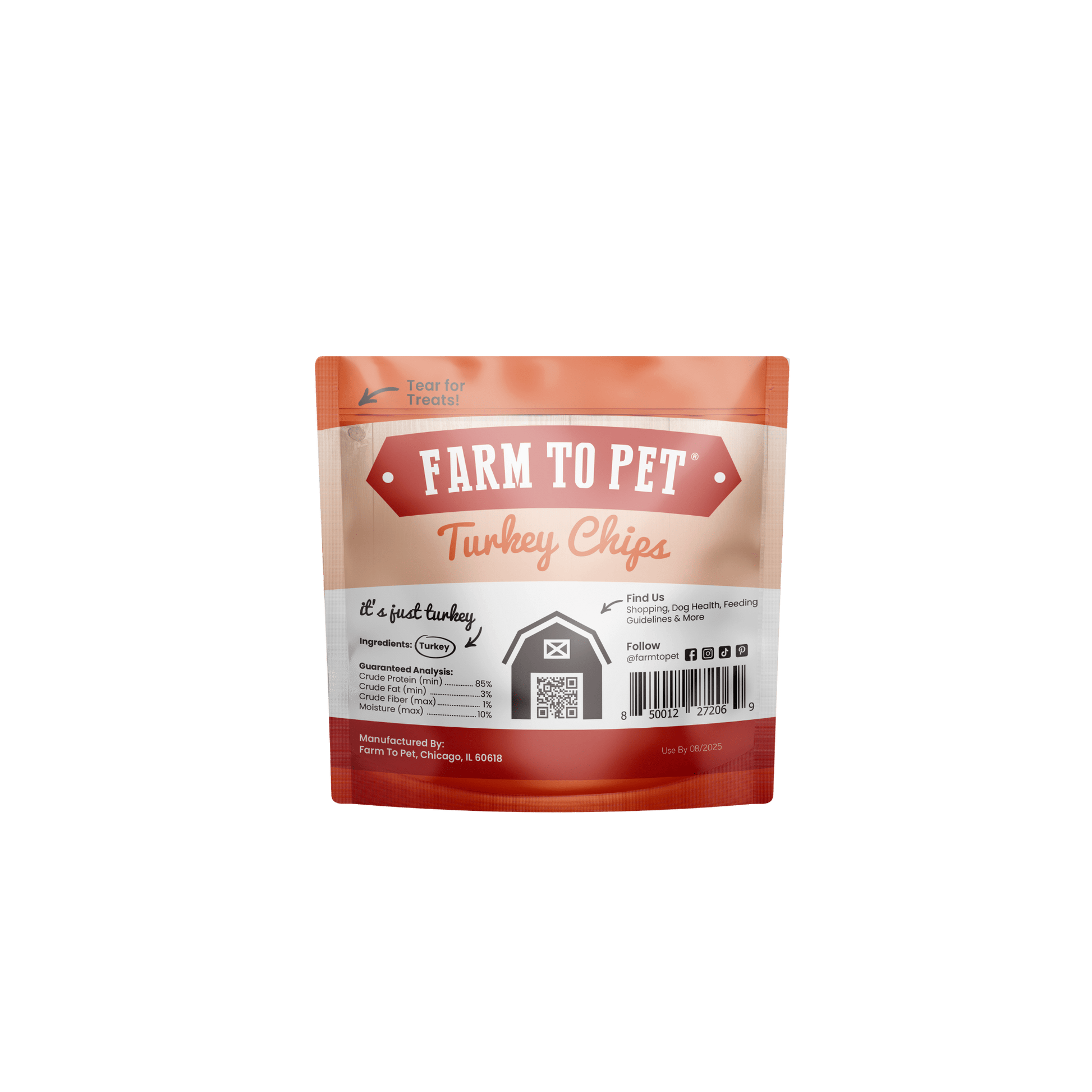 Convenient for training, travel and on the go, each Farm to Pet Snack Pack contains six all-natural Turkey Chips you can feed whole or in pieces to your fur baby. As a novel protein, turkey is also easier for many pets to digest and less likely to cause allergic reactions or food sensitivities.